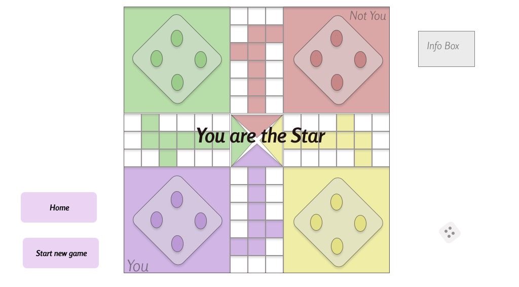 - Game board: Selected color is always displayed as the bottom home box and all other colors are rotated accordingly in the same order.